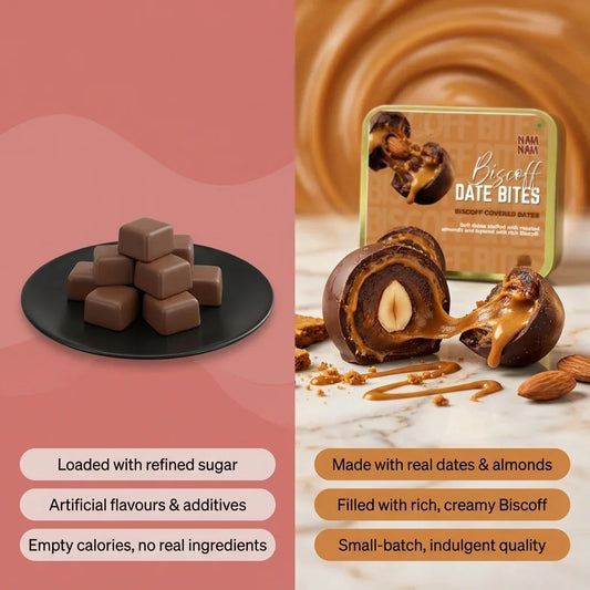 Most Nam Nam goodies (like brittles, popcorn, and candies) stay perfectly fresh for 6–9 months when stored in a cool, dry place -no refrigeration needed. Each pack has a “Best Before” date mentioned on it for your peace of mind.