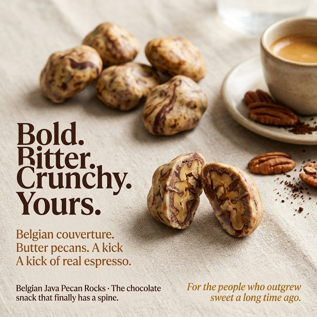 Butter pecans - whole, crunchy, unapologetic - smothered in thick Belgian couverture and hit with a kick of real espresso. Not coffee flavouring. Real Java coffee. The kind of bitter that makes the sweet hit harder.