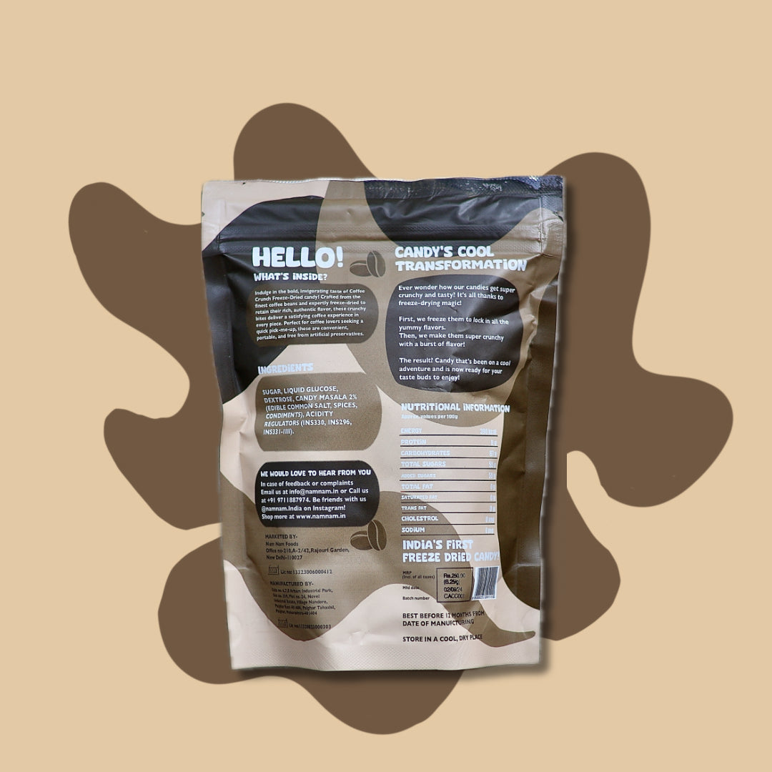 Liquid Glucose, Sugar, Edible Vegetable Oil (Palm Oil), Milk Solids (3%), Coffee Extract (0.5%), Butter, Edible Common Salt (Iodized), Emulsifier (Soy Lecithin E322 (i)), Natural Food Colour (E150d), Artificial Flavours (Coffee, Milk, Vanilla).