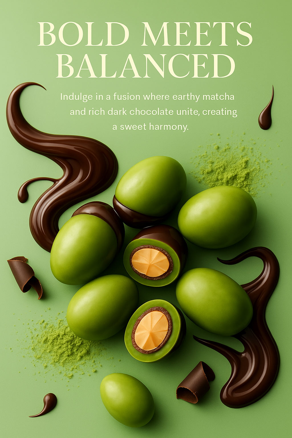 Whole roasted almonds, first dipped in rich Belgian dark couverture chocolate, then delicately enrobed in a smooth white chocolate infused with premium Japanese matcha. Bold, creamy, and perfectly balanced—the crunch, the melt, the moment. This is indulgence, elevated