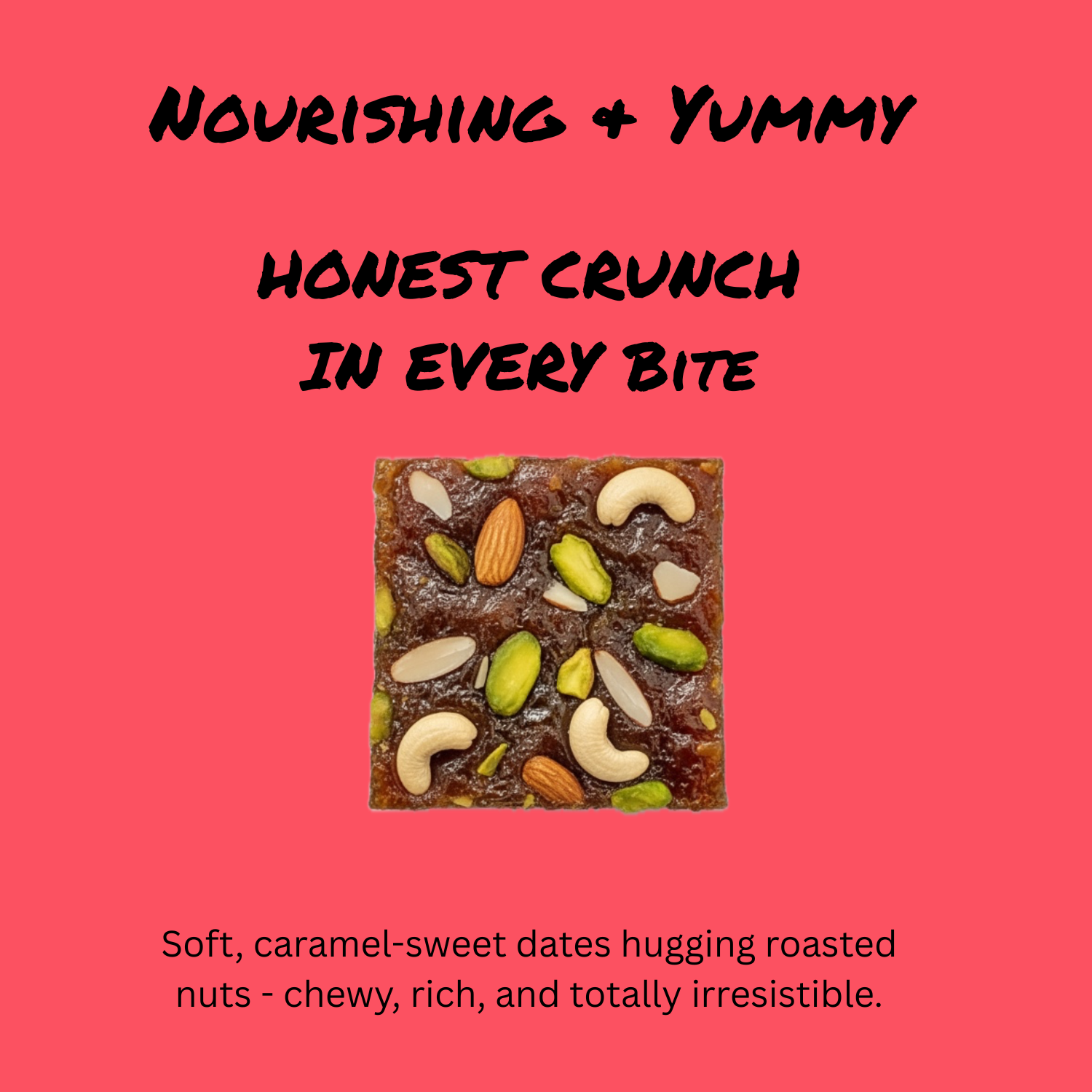 Plump, caramel-sweet dates meet the crunch of almonds, cashews, and pistachios-all bound together with a drizzle of honey and a touch of pure desi ghee. Nothing else. No fillers, no preservatives.