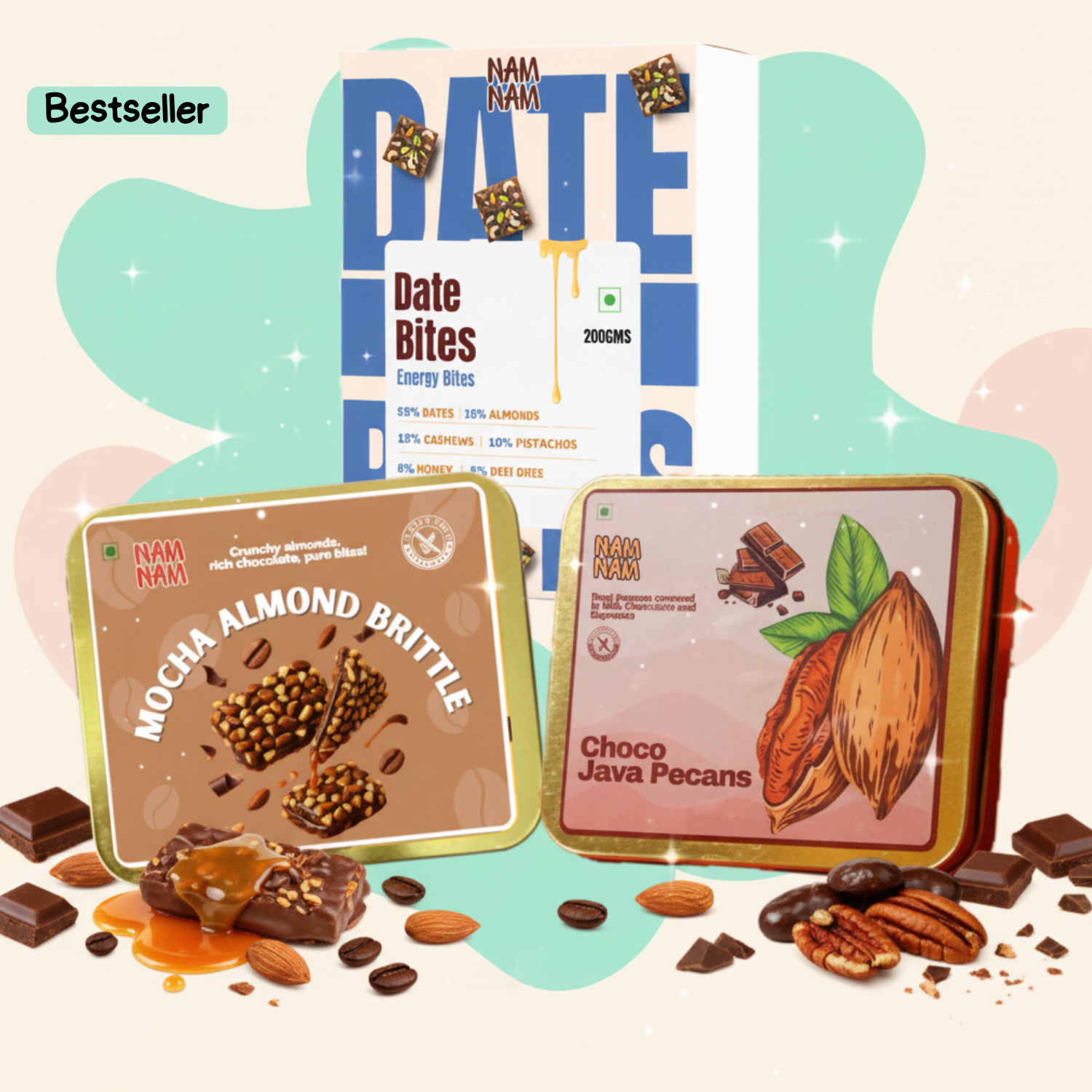 Most Nam Nam goodies (like brittles, popcorn, and candies) stay perfectly fresh for 6–9 months when stored in a cool, dry place -no refrigeration needed. Each pack has a “Best Before” date mentioned on it for your peace of mind.