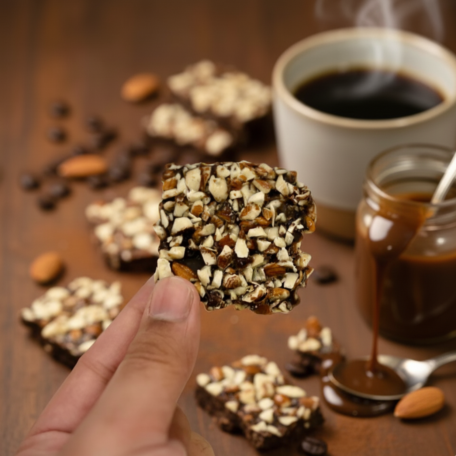 Crafted with slow-roasted almonds, silky chocolate, and a hint of mocha magic, every bite is the perfect balance of crunch, sweetness, and espresso warmth.