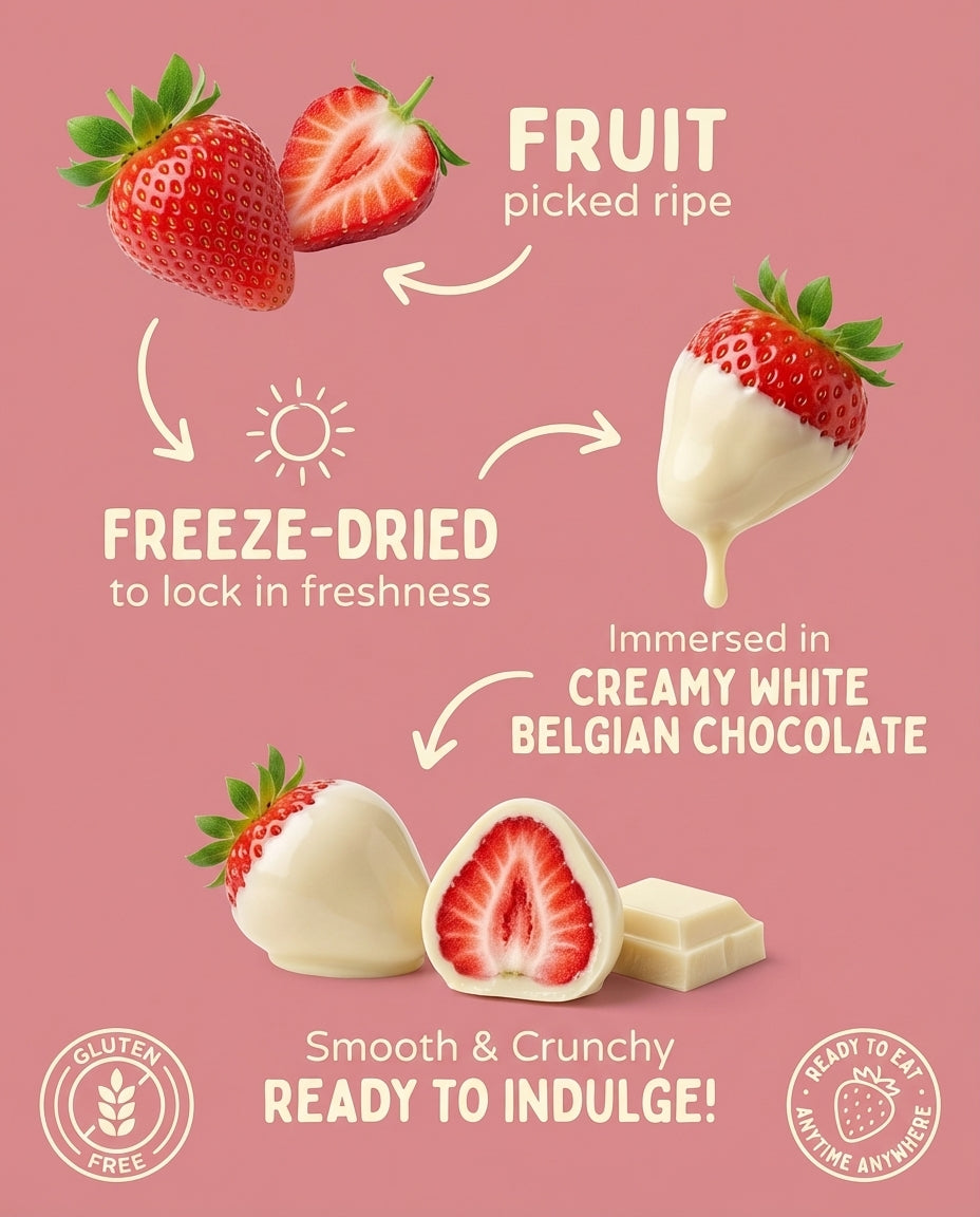 These aren’t your average chocolate strawberries. We start with real, juicy strawberries, freeze-dried at peak ripeness to lock in the flavor. Then we dip them in slow-tempered Belgian couverture white chocolate